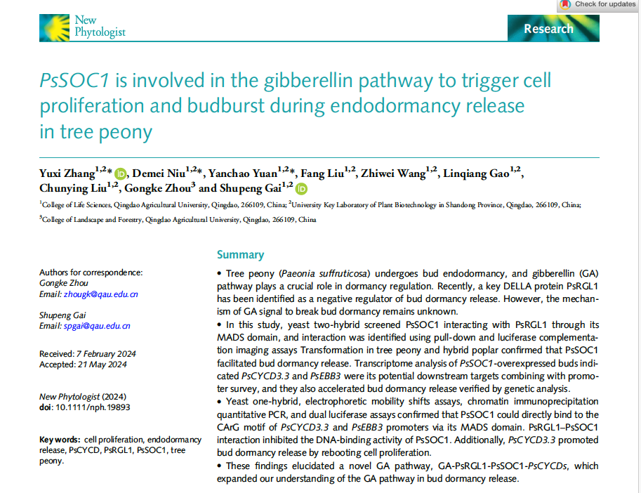 近日,太阳成集团tyc234cc盖树鹏、园林与林公司周功克团队合作在New Phytologist上发表了题为“PsSOC1 is involved in the gibberellin pathway to trigger cell proliferation and budburst during endodormancy release in tree peony”的研究论文。该研究发现了一种GA信号的新途径,解析了牡丹PsSOC1作为GA信号的重要组分通过重启细胞周期调控芽休眠解除的分子机制。