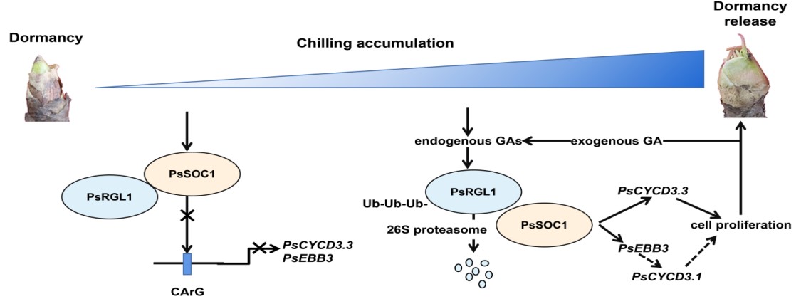 综上所述,该研究结果揭示了一条新的GA途径,PsRGL1-PsSOC1-PsCYCDs(图1),丰富了GA参与芽休眠解除的分子机制,也为牡丹花期分子育种提供候选基因资源。