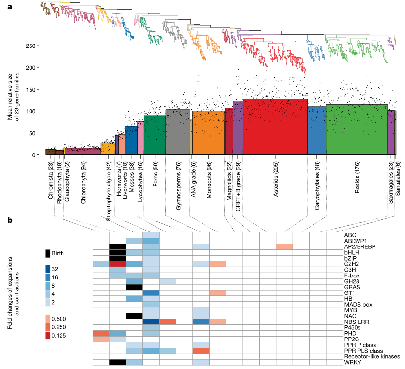 基因家族的显著扩张和减缩是导致植物代谢、调控和信号转导进化的主要因素之一。该论文对植物里最大的23个功能基因家族在不同物种中的进化进行了分析,推断AP2, bHLH, bZip和WRKY 转录因子家族应该是在绿色植物界最后的共同祖先中开始出现;而GRAS和NAC基因家族的起源则发生在与绿藻谱系分化后的早期链霉菌中。最显著的基因家族扩张和减缩事件是发生在绿色植物界出现和维管植物进化形成的过程中,但是在被子植物出现的过程中并没有发现有基因家族的扩张。该论文的研究为增进我们对绿色植物的总体系统发育和在进化过程中发生的重大遗传变化的理解奠定了基础。