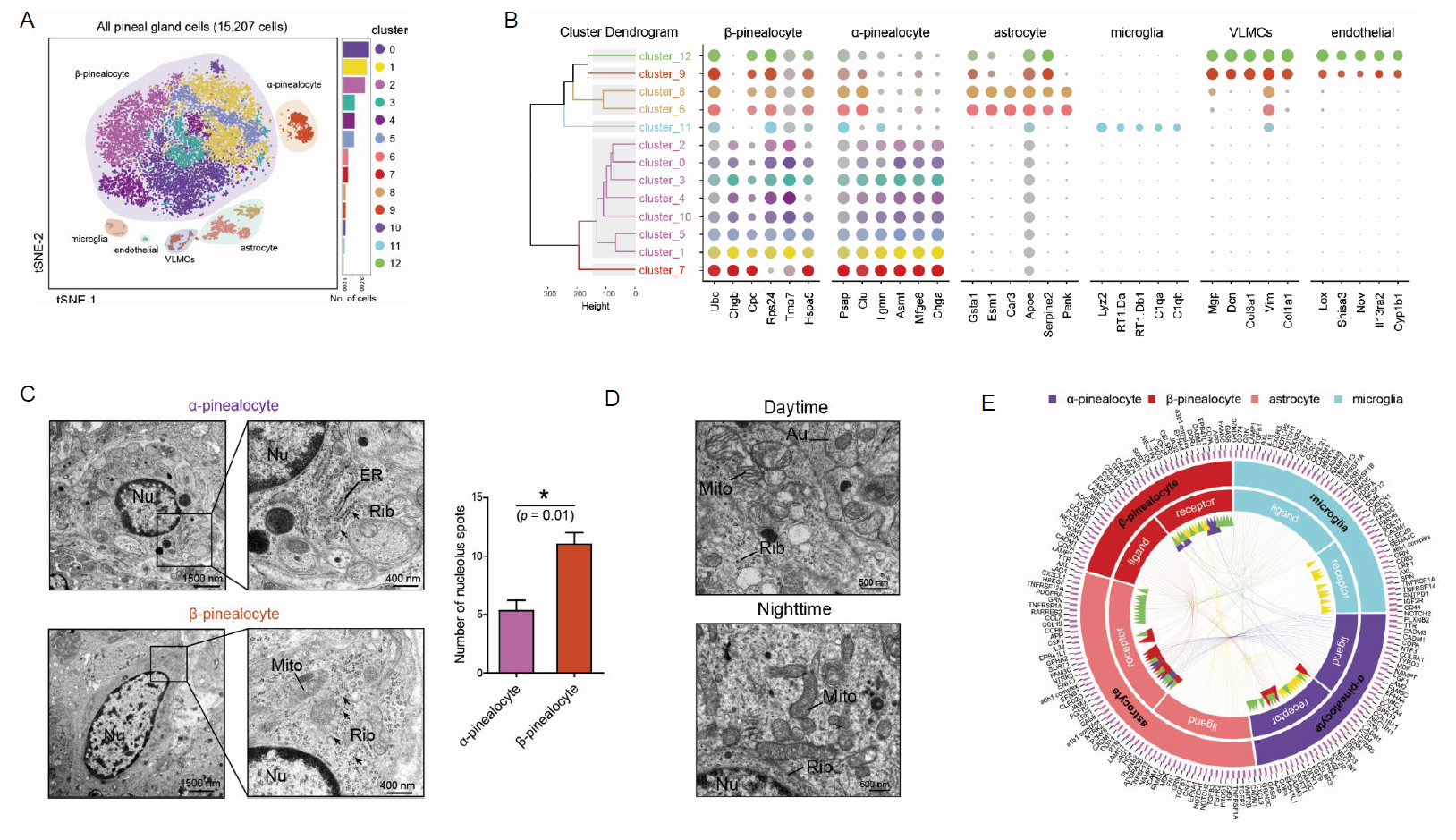 沈伟课题组基于美国国家卫生研究院David C Klein教授课题组关于大鼠松果体单细胞转录组测序数据集的深入挖掘,通过比较白天与黑夜大鼠松果体单细胞转录组测序数据集,发现线粒体自噬在松果体中呈现昼夜节律变化。借助透射电镜观察白天和黑夜状态下的松果体细胞的内部超微结构,发现白天状态下的松果体细胞存在大量的线粒体自噬现象,但是在夜晚,松果体细胞中的线粒体则处于正常状态,并且线粒体数量明显多于白天。鉴于此,沈伟课题组提出节律性变化的线粒体自噬通过影响松果体细胞内的ATP可用性,影响β-松果体细胞中Aanat等关键酶合成,最终导致节律性褪黑素释放的模型,并利用线粒体标记的转基因小鼠模型验证了上述现象。