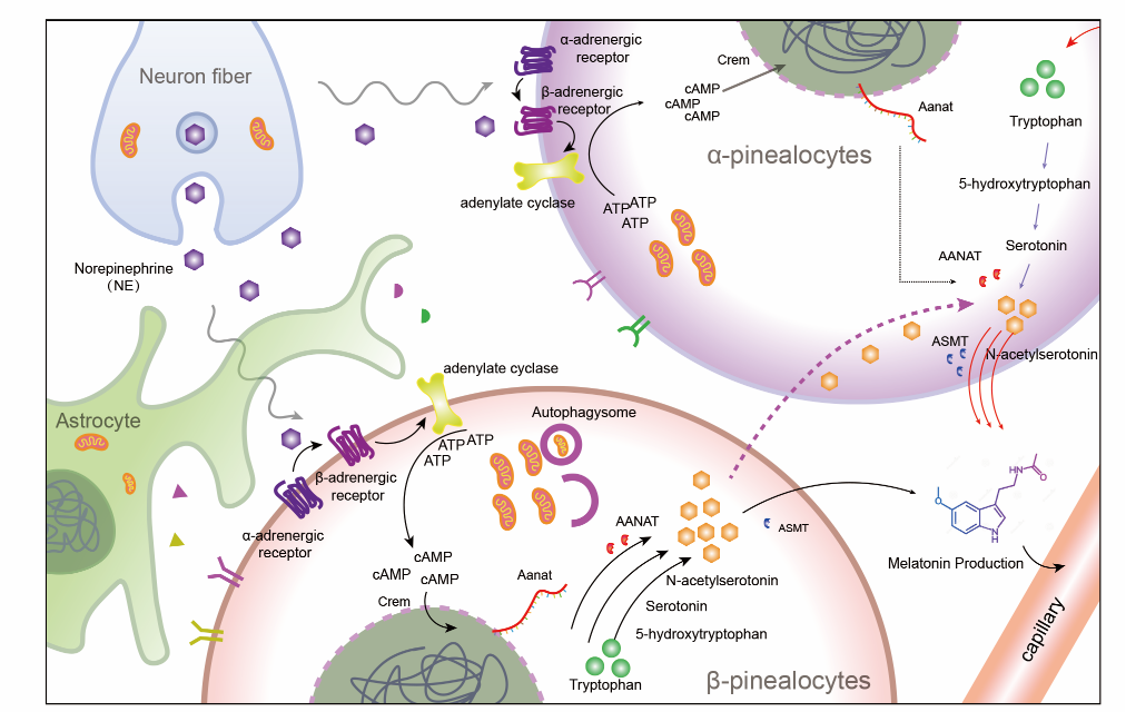褪黑素主要由哺乳动物脑部的松果体分泌,具有调节睡眠、抗衰老以及体内活性氧等一系列重要的生物学功能。褪黑素在机体内的含量呈现节律性变化,正常情况下,夜晚时血液中褪黑素水平较高,白天激素水平相对较低。但昼夜节律调控松果体细胞分泌褪黑素的分子机制仍不清晰。