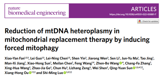 2022年4月18日,国际知名期刊Nature Biomedical Engineering以Article形式在线发表了题为Reduction of mtDNAheteroplasmy in mitochondrial replacement therapy by inducing forced mitophagy的研究论文,介绍了一种利用强制性线粒体自噬清除线粒体置换过程中残留线粒体DNA的技术体系。利用该体系,可有效、安全清除线粒体置换过程中来源于核供体胚胎中的线粒体及其DNA,经过优化后,有望进一步提高临床上的线粒体置换效率,从而为通过辅助生殖技术阻断遗传性线粒体疾病提供新的治疗策略。
