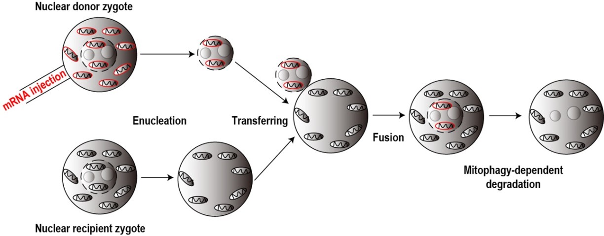 图2,利用强制性线粒体自噬降解线粒体置换过程中来源于核供体胚胎的线粒体模式图