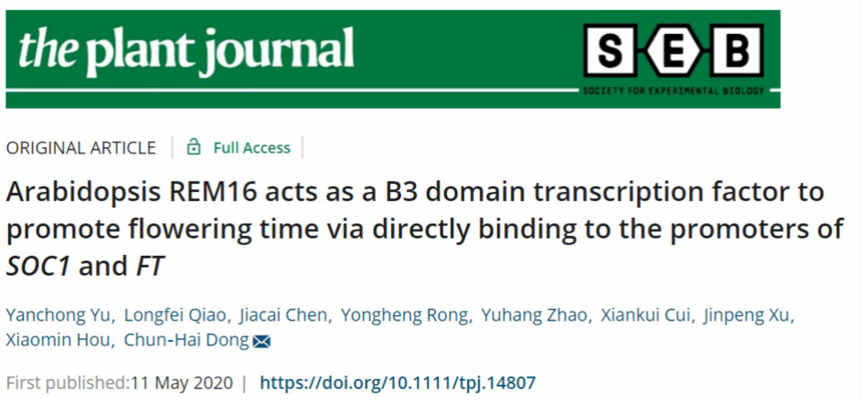 2020年5月11日, 植物学领域TOP期刊Plant Journal(五年平均IF= 6.467,SCI一区,https://doi.org/10.1111/tpj.14807)在线发表了太阳成集团tyc234cc董春海课题组关于B3结构域蛋白-REM16转录因子调控拟南芥开花分子机制的研究论文。太阳成集团tyc234cc为独立研究单位,于延冲副教授和研究生乔龙飞、陈家才为论文共同第一作者,董春海教授为通讯作者。该论文获得国家自然科学基金的资助,得到生科院农业分子生物学平台仪器的支撑。