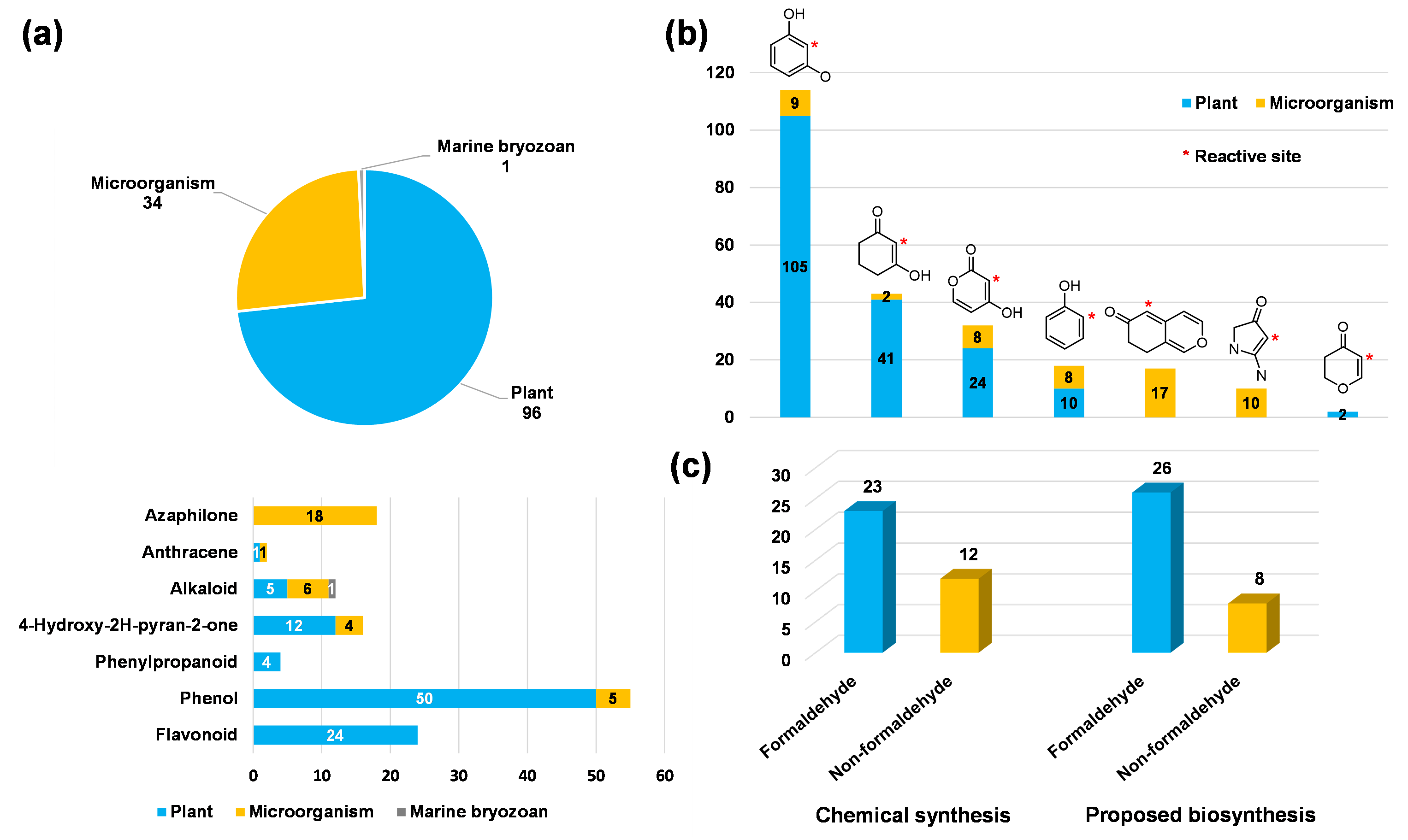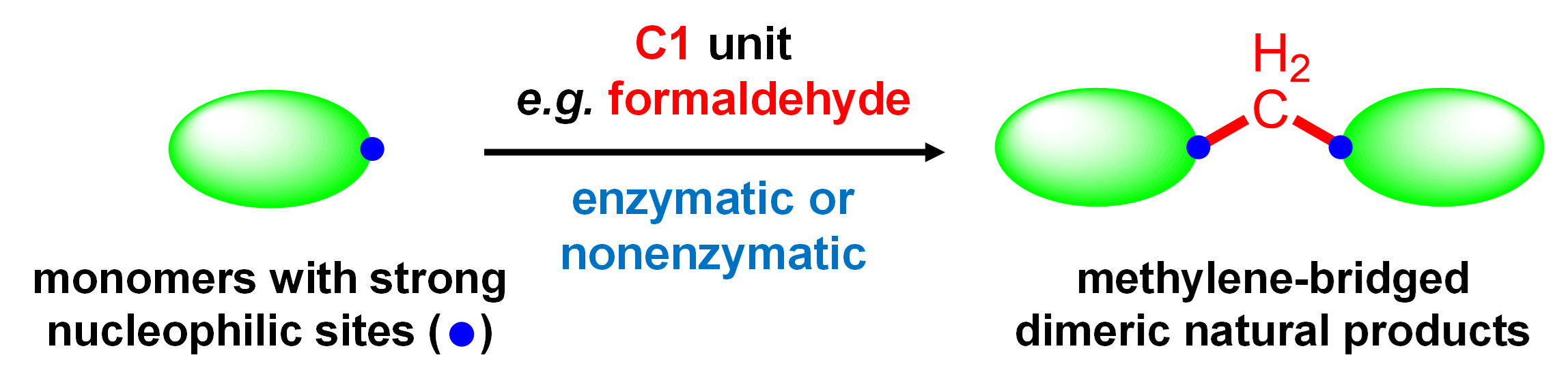 该研究聚焦天然来源的亚甲基桥联二聚体,在国际上首次全面系统地总结了131个该类型天然产物的结构、来源、生物活性、化学合成以及生物合成的相关内容(图1),重点围绕亚甲基的来源及可能的非酶催化形成过程进行了阐释和探讨,为甲醛参与的二聚体类天然产物的形成机制研究提供了重要指导,也为其化学空间拓展提供了有效参考。