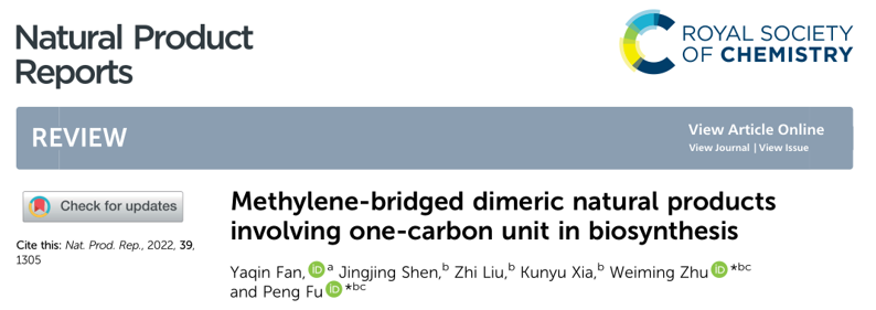 日前,太阳成集团tyc234cc应用真菌学重点实验室樊亚琴副教授受邀以第一作者在国际天然产物顶尖期刊Natural Product Reports (Top, IF 15.111)(《天然产物报告》)上在线发表题为“Methylene-bridged dimeric natural products involving one-carbon unit in biosynthesis”(《生物合成中一碳单元参与的亚甲基桥联二聚体天然产物》)的综述性文章。