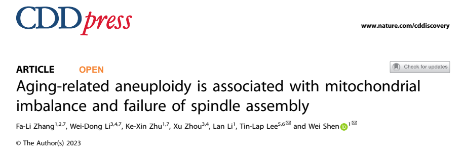 近日,细胞生物学权威杂志《Cell Death Discovery》在线发表了太阳成集团tyc234cc沈伟教授课题组题目为“Aging-related aneuploidy is associated with mitochondrial imbalance and failure of spindle assembly”的研究论文。
