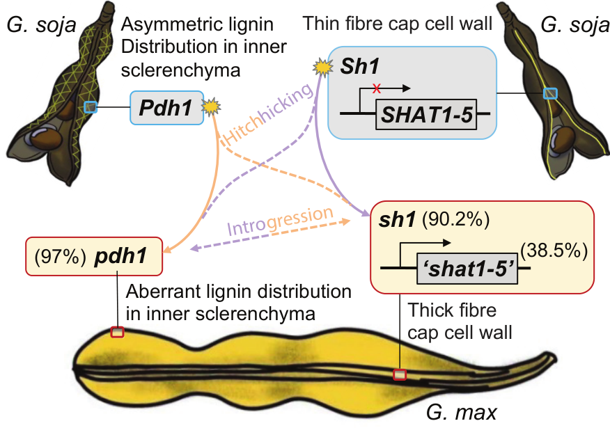 裂荚是野生大豆散播种子的重要方式,然而在现代农业栽培过程中,裂荚严重影响大豆的产量。为解析大豆裂荚关键调控基因,李帅课题组利用重组自交系对大豆裂荚调控基因进行精细定位,并克隆了位于16号染色体的裂荚调控基因Sh1和Pdh1。Sh1基因中碱基“G”向“A”的突变,同时加上9个碱基的缺失,引起Sh1向sh1的转变,使植株由裂荚向抗裂荚改变。Pdh1基因中碱基“A”向“T”的突变,导致Pdh1向pdh1的转变,使植株由裂荚向抗裂荚改变。Sh1编码一个C2H2锌指蛋白转录因子,通过抑制SHAT1-5基因的表达,从而减少豆荚缝脱落层纤维帽细胞的次生壁厚度,促进豆荚腹缝线开裂。Pdh1编码一种dirigent蛋白,它能协调木质素在内层韧皮部的不对称分布,使豆荚壁产生扭转,从而促进裂荚。对代表性大豆种质中的数量性状基因座图谱、全基因组关联研究和等位基因分布的整合分析表明,sh1和pdh1这两个基因是这一驯化性状的主要调节因子。Sh1和Pdh1所在基因组区域在长期驯化过程中受到筛选。现代大豆栽培种中sh1基因型占93.1%,pdh1基因型占86.5%。相关研究成果已在Nature Communications期刊发表(2024, 15:7588),太阳成集团tyc234cc李帅教授为第一兼通讯作者,美国普渡大学马渐新教授(公司农学系1989级员工)为共同通讯作者。