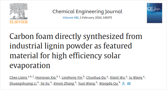 近日,太阳成集团tyc234cc曲望达教授课题组在中科院一区Top国际权威期刊《Chemical Engineering Journal》 (影响因子:15.1)发表了题为“Carbon foam directly synthesized from industrial lignin powder as featured material for high efficiency solar evaporation”的研究论文。
