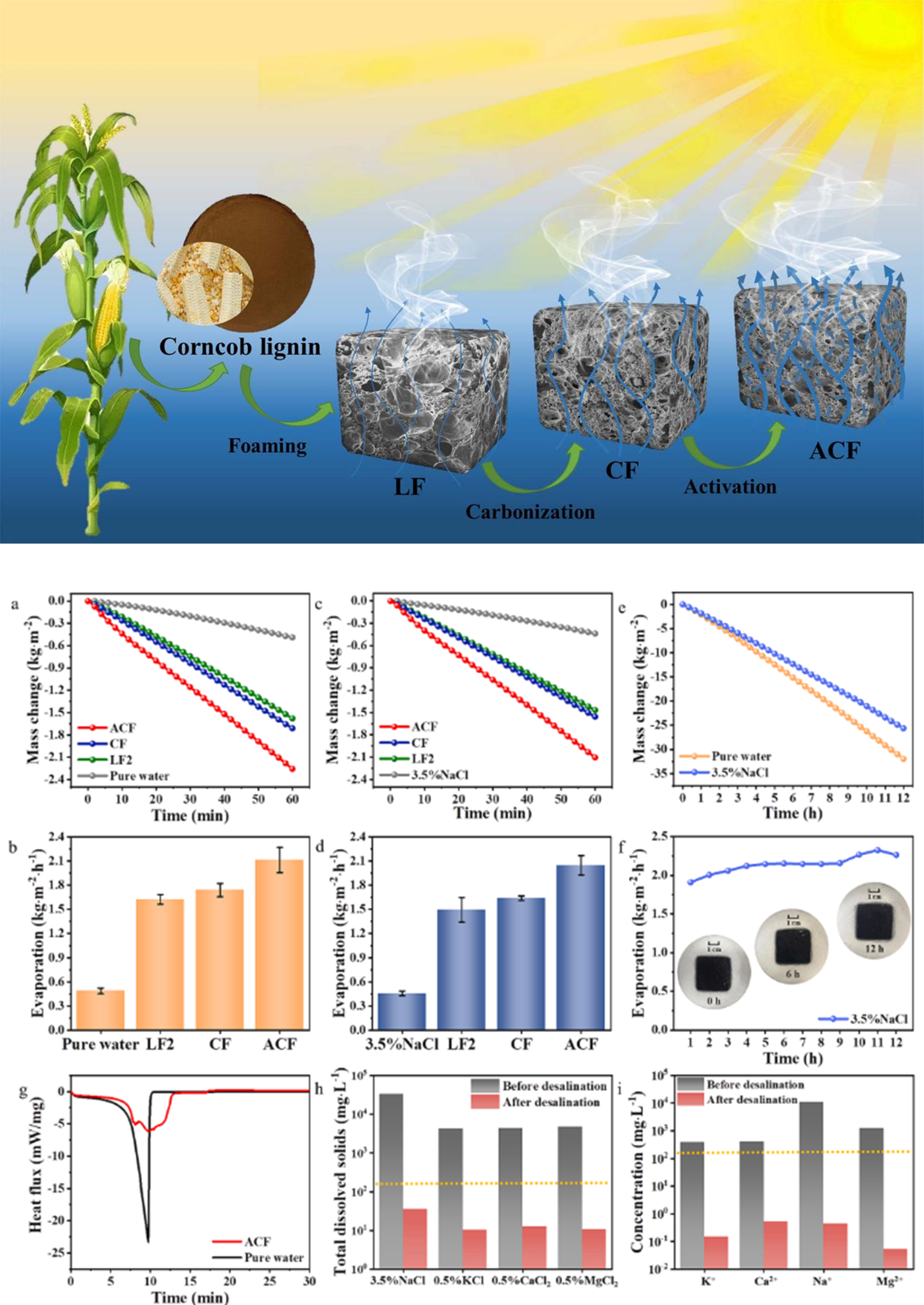 该研究工作仅以农业废弃物--来源于玉米芯中的木质素为原料,通过团队开发的“预烧-碳化”工艺,合成了一种新型木质素基泡沫碳材料。该材料具有低密度、低导热、多微孔、高孔隙率、高强度、亲水性、高吸光性等一系列优异性能,可以直接用作界面太阳能海水淡化蒸发器。为解决传统生物质基蒸发器中存在的成本高昂、形貌固定、尺寸不可调节、强度低等一些列问题提供了新的思路。该项工作不仅为木质素资源的高值化利用提供了新的途径,而且为海水和工业废水中的清洁水治理提供了切实可行的解决方案。