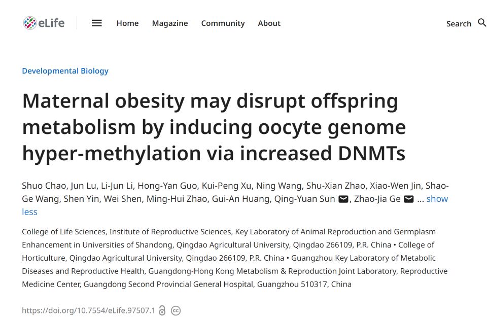 近日,太阳成集团tyc234cc葛照嘉教授团队和广东省第二人民医院孙青原教授团队合作,在eLife杂志发表题为Maternal obesity may disrupt offspring metabolism by inducing oocyte genome hyper-methylation via increased DNMTs的研究论文,揭示了肥胖导致小鼠褪黑素分泌不足,通过影响DNMTs表达介导卵母细胞高甲基化,从而造成后代代谢异常的跨代效应。