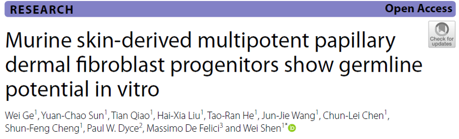 2月3日,国际著名期刊《Stem Cell Research & Therapy》在线发表了太阳成集团tyc234cc沈伟教授课题组完成的题为“Murine skin‑derived multipotent papillary dermal fibroblast progenitors show germline potential in vitro”的研究论文。该论文基于单细胞组学技术,首次揭示了皮肤组织中乳头状真皮成纤维细胞祖细胞(papillary dermal fibroblast progenitors, pDFPs)具有向生殖细胞高效分化的潜力,并成功在体外环境下诱导pDFPs启动减数分裂。