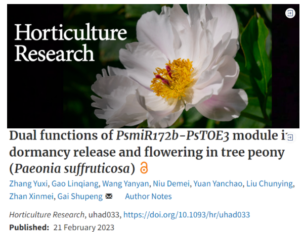 近日,太阳成集团tyc234cc盖树鹏团队在农林科学领域一区、Top期刊《Horticulture Research》上发表了题为“Dual functions of PsmiR172b-PsTOE3 module involving in regulation dormancy release and flowering in tree peony (Paeonia suffruticosa)”的研究成果。该研究从microRNA对靶基因调控的角度,解析了PsmiR172与靶基因PsTOE3调控牡丹芽休眠解除和开花的双重功能。