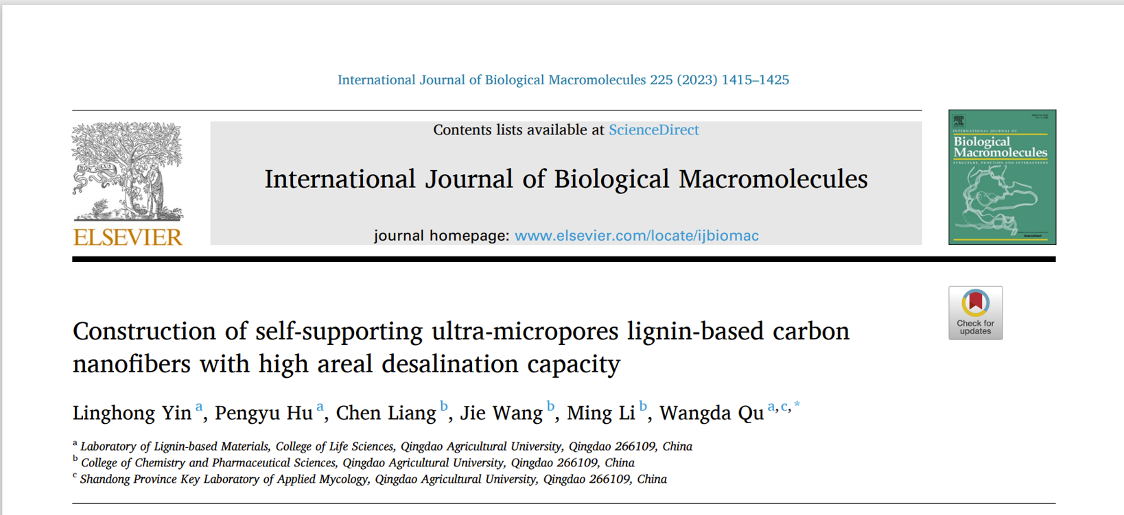 近日,太阳成集团tyc234cc曲望达教授课题组在中科院一区国际权威期刊《International Journal of Biological Macromolecules》上发表了题为“Construction of self-supporting ultra-micropores lignin-based carbon nanofibers with high areal desalination capacity”的研究论文。该论文通过简单温和的静电纺丝、氧化稳定和碳化技术制备了具有富超微孔的木质素基碳纳米纤维柔性电极,为高负载厚电极在海水淡化等领域的利用提供了新思路。