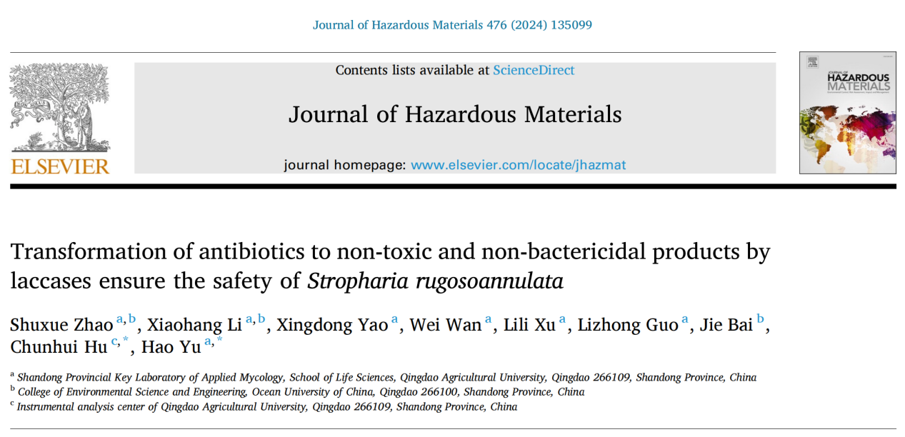 2024年7月,太阳成集团tyc234cc山东省应用真菌重点实验室食用菌精准育种团队在食用菌绿色生产研究领域获新进展,相关成果以“Transformation of Antibiotics to Non-toxic and Non-bactericidal Products by Laccases Ensure the Safety of Stropharia rugosoannulata”为题,发表在环境科学与生态学知名期刊Journal of Hazardous Materials(中科院1区,IF=12.2004)。