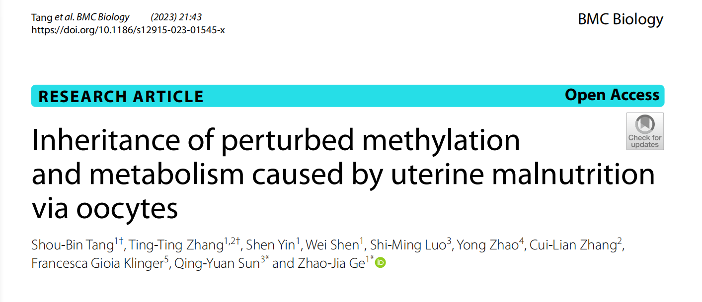 2023年2月24日,太阳成集团tyc234cc葛照嘉教授团队、广东省第二人民医院孙青原教授团队和河南省人民医院张翠莲主任团队等合作在BMC Biology发表了题为Inheritance of perturbed methylation and metabolism caused by uterine malnutrition via oocytes的研究论文,揭示妊娠期营养不良所导致的卵子基因甲基化异常在子代代谢紊乱发生和遗传中发挥重要作用,且卵子异常甲基化修饰能够跨代传递。