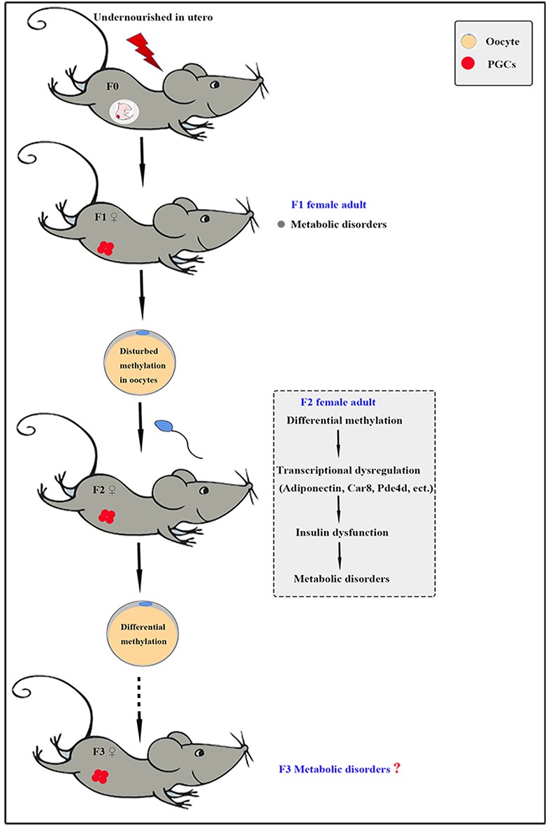 图1:妊娠期营养不良导致的子代卵子甲基化异常通过雌性跨代遗传模式图