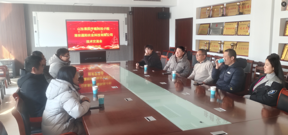 2026 年 1 月 22 日,受淮安通阳农业科技有限公司邀请,国家级科技小院—山东莱阳平菇科技小院首席专家李树文副教授,率科技小院经理丁佳乐硕士、常驻研究生李昆鹏开展专项技术交流。双方就平菇类工厂化生产工艺、平菇子实体销售、平菇菌渣资源化利用方面进行了技术交流。淮安通阳农业科技有限公司来访人员有尤为民董事长、徐文俊总经理、仇健技术员、袁海霞办公室主任,同时潍坊蕈园农业科技有限公司总经理张涛、技术总监鞠金龙、销售总监宋文琪一同交流。