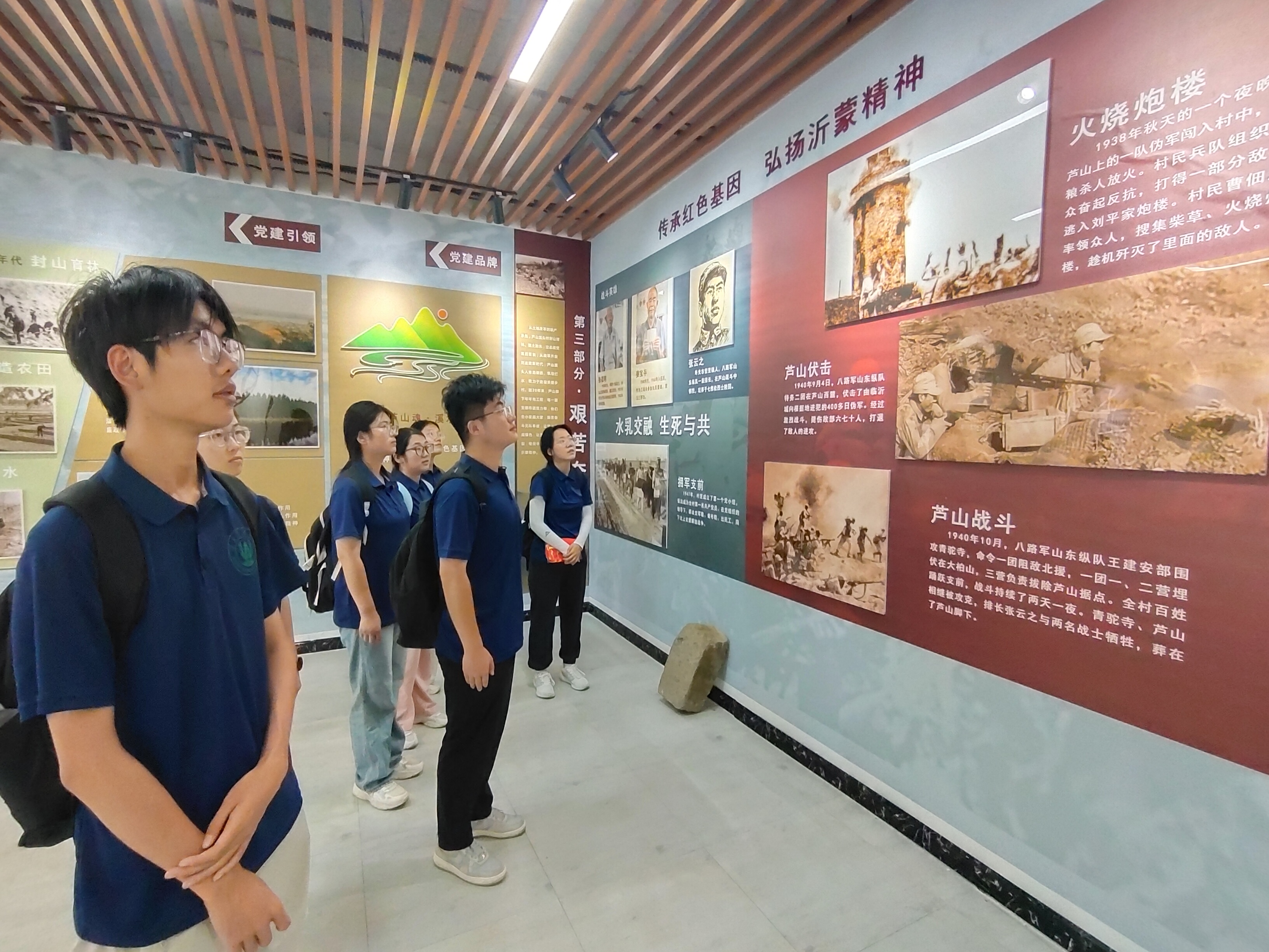 为追寻革命足迹,团队探访了东高庄村。这里是《跟着共产党走》红歌诞生地。队员们在走访的过程中,了解了《跟着共产党走》的诞生背景,学习并歌唱这首红歌。在山东抗日民主政权创建纪念馆,跟随讲解员的脚步,队员们系统学习了山东根据地艰苦卓绝的奋斗史,深刻体悟“党群同心、军民情深、水乳交融、生死与共”的沂蒙精神内核。“红歌在这里唱响,精神在这里孕育。作为新时代青年,我们必须让这红色血脉永续流淌!”实践团队长彭宇航在参观后坚定地表示。