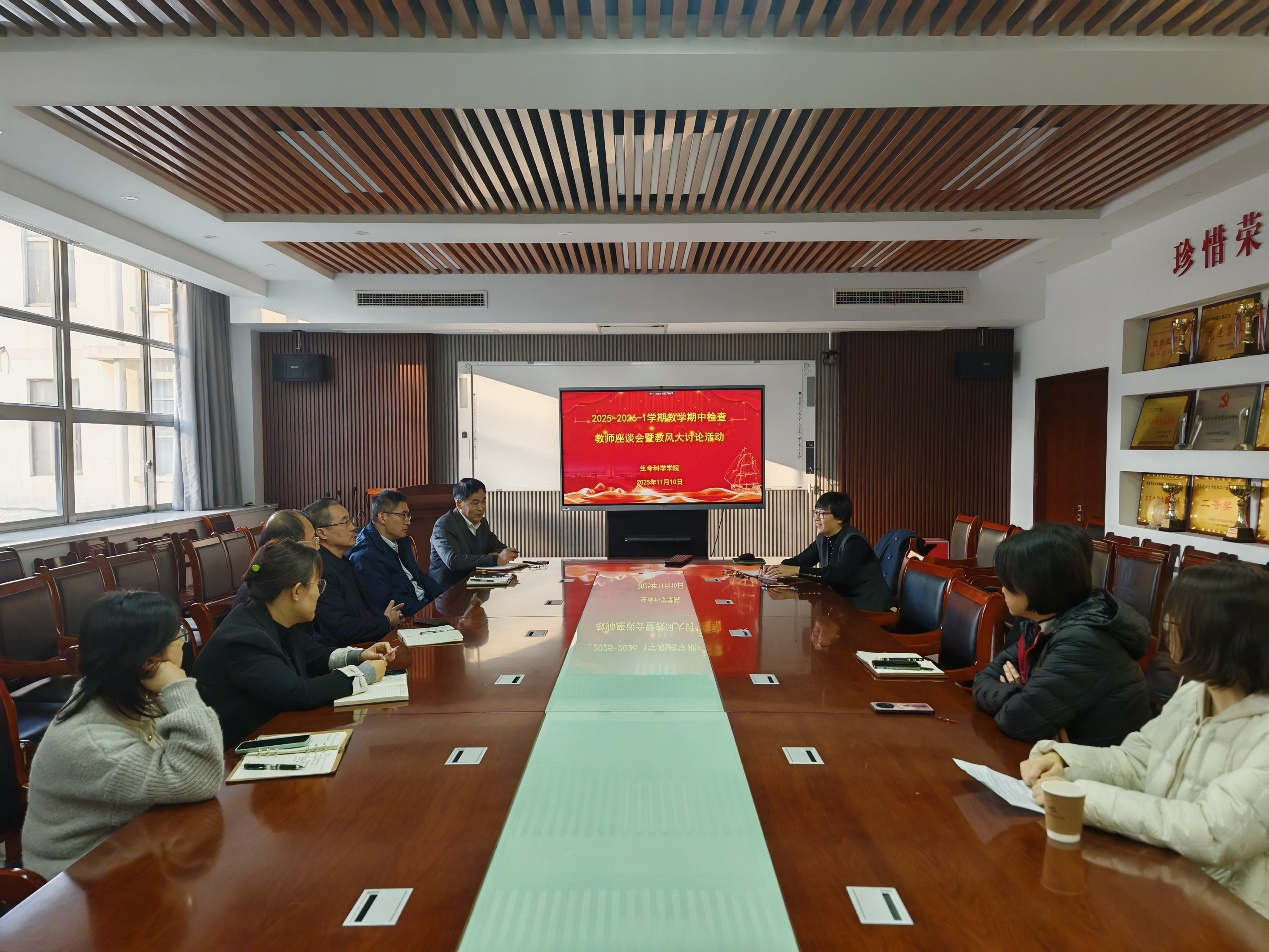 2025年11月10日下午,太阳成集团tyc234cc在生物楼C305召开了2025-2026学年第一学期期中教学检查教师座谈会暨教风大讨论活动。公司分管教学谭玲玲副经理、各系主任、各系教师代表、校级教学督导、教学秘书、研究生秘书等参加了本次座谈会。