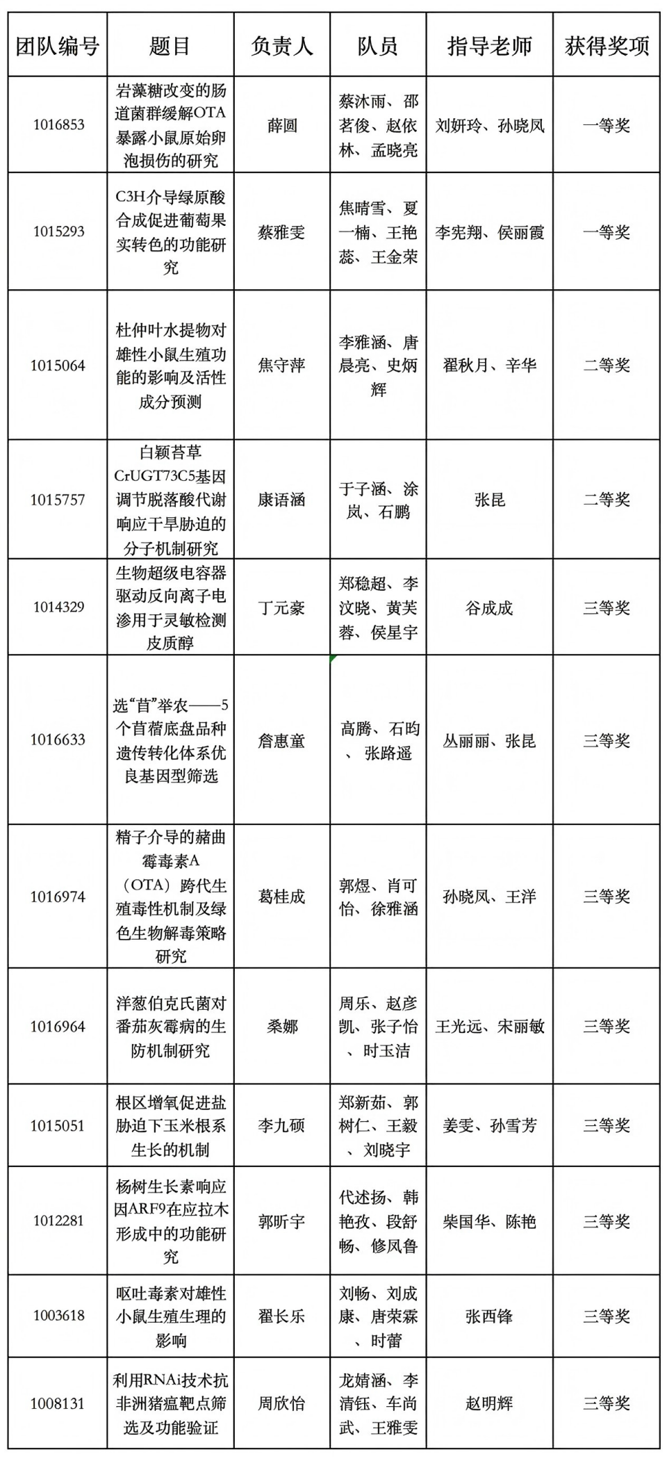 其中太阳成集团tyc234cc薛圆团队(指导教师:刘妍玲、孙晓凤)“岩藻糖改变的肠道菌群缓解OTA暴露小鼠原始卵泡损伤的研究”、蔡雅雯团队(指导教师:李宪翔、侯丽霞)“C3H介导绿原酸合成促进葡萄果实转色的功能研究”获得全国一等奖,焦守萍团队(指导教师:翟秋月、辛华)“杜仲叶水提物对雄性小鼠生殖功能的影响及活性成分预测”获全国二等奖。