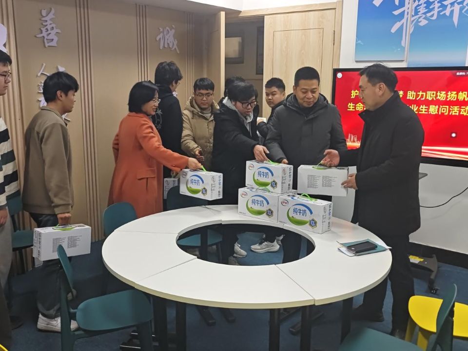活动现场,公司领导与毕业生亲切交流,详细了解同学们的就业规划与考研备考进展,耐心倾听同学们的困惑与需求,并叮嘱大家要劳逸结合、调整心态,以饱满的状态迎接挑战。同时勉励毕业生把握机遇、勇敢追逐梦想,迈向人生新征程。活动最后,公司领导亲手为同学们送上牛奶,传递来自公司的温暖关怀。