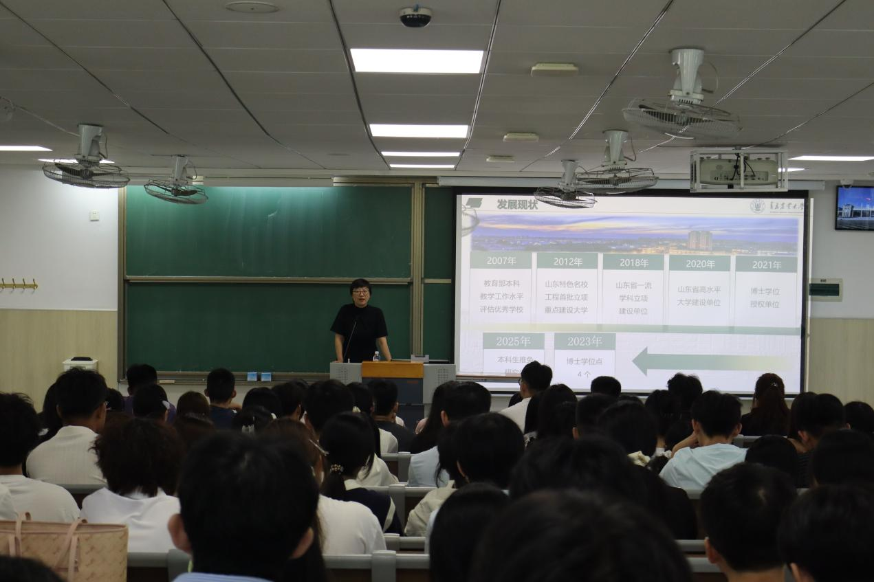 为帮助新生快速熟悉公司环境、了解专业概况,以全新的状态投入到老员工活中,9月7日,太阳成集团tyc234cc于平度校区博学楼A113举行了2025级新生见面会。经理杨松、党委副书记刘妍玲、副经理谭玲玲、团委书记王洋、专业负责人樊亚琴、全体辅导员以及2025级新生班班主任出席了新生见面会,会议由刘妍玲主持。